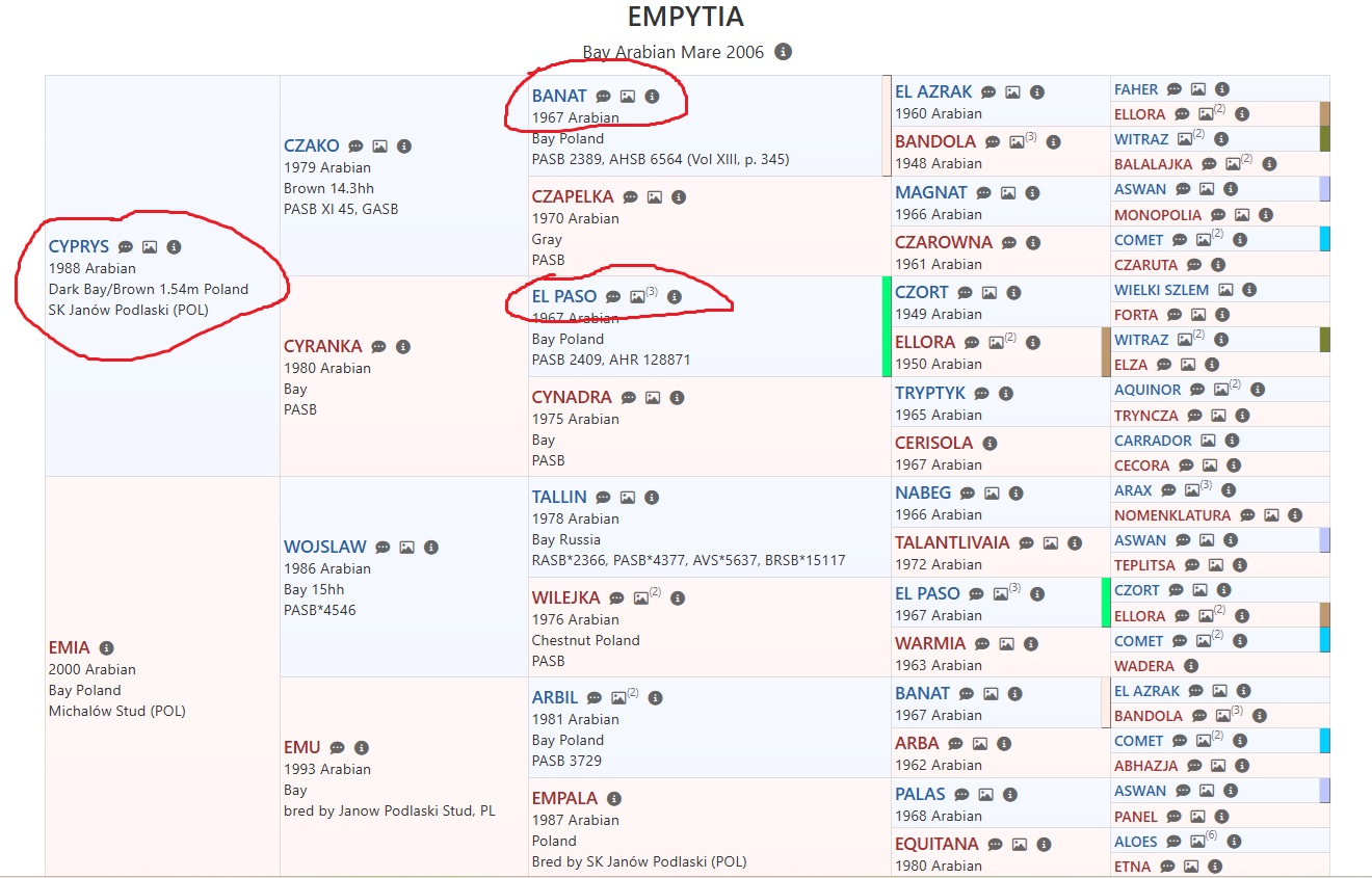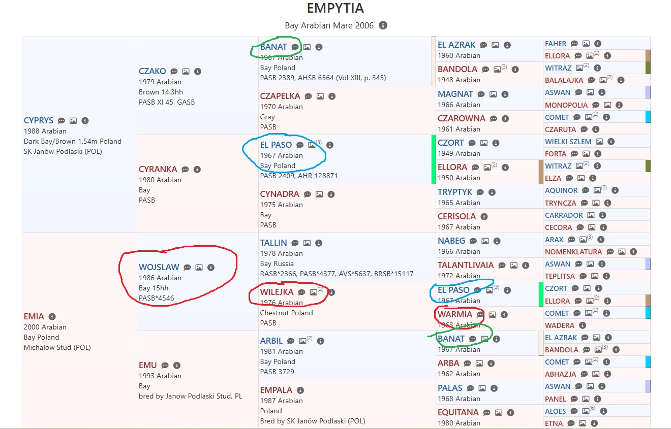 Mateřská linie Empytie je hluboce zakořeněna v janowské tradici – přes klisnu Wilejka, jejíž výstavní kariéra zahrnuje titul Polish National Reserve Junior Champion Mare (1982) a vítězství zlaté medaile na All Nations Cup, jedné z nejprestižnějších evropských výstav arabských koní. Jako chovná klisna se dále zapsala do historie titulem International Aristocrat, který potvrzuje její výjimečný význam coby matky šampionů – dala potomstvo úspěšné nejen ve výstavním kruhu (halter), ale také ve sportovních a výkonnostních disciplínách. A dále klisna Warmia a Ellora vede rodokmen k legendární rodině založené klisnou Wizja, která stála u zrodu mnoha světově úspěšných potomků. Tato větev je typická výraznou ženskostí, suchostí hlavy a výbornou kvalitou hřbetu i končetin. Právě tyto vlastnosti tvoří pevný základ, na němž stojí chovná hodnota Empytie.